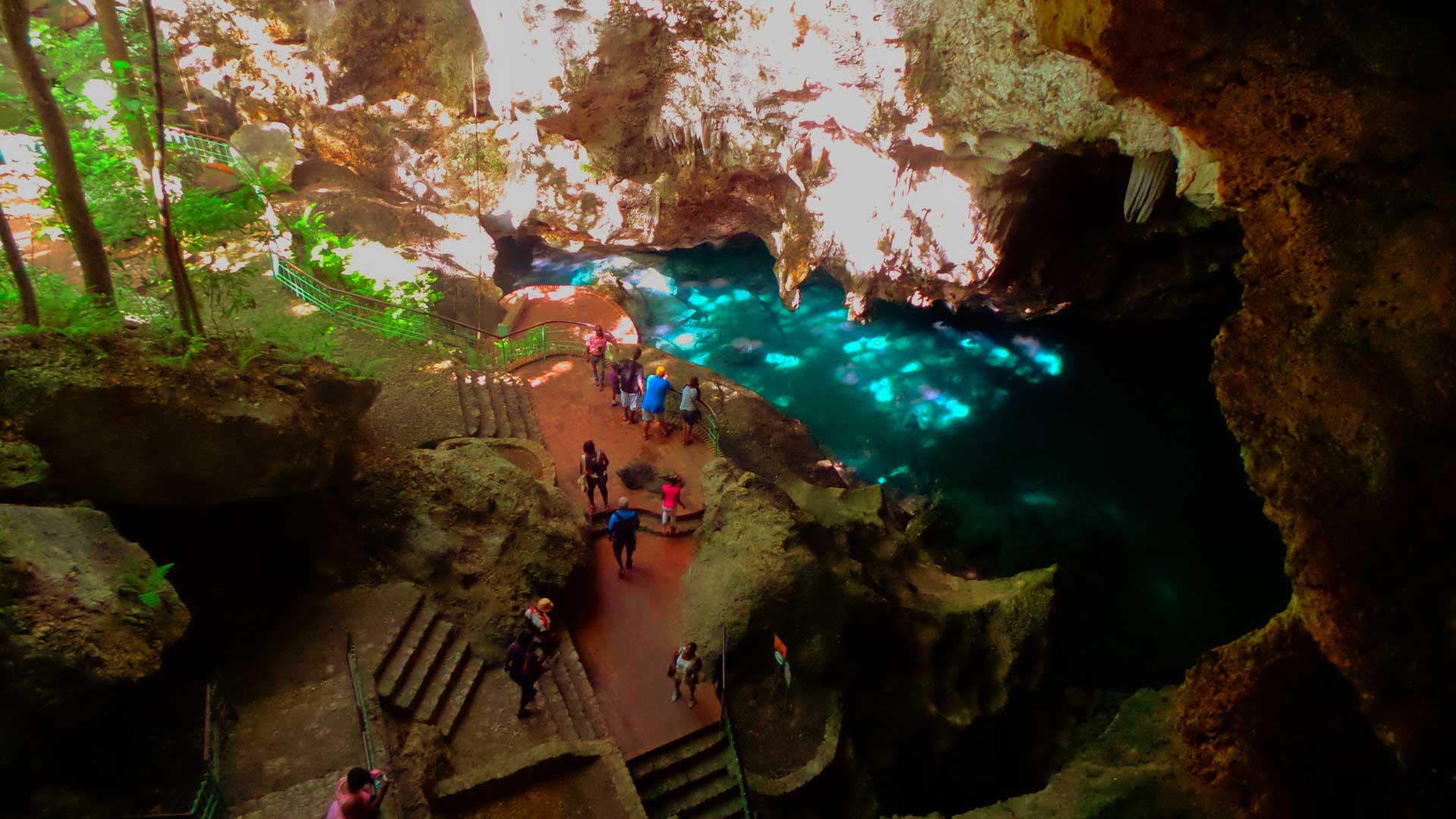 Auf dem Programm steht auch der Besuch der Höhle der drei Augen, eine Tropfsteinhöhle, nach oben offen mit glasklaren, blauen Lagunen. Ein toller Einblick in die „Unterwelt“ von Santo Domingo.